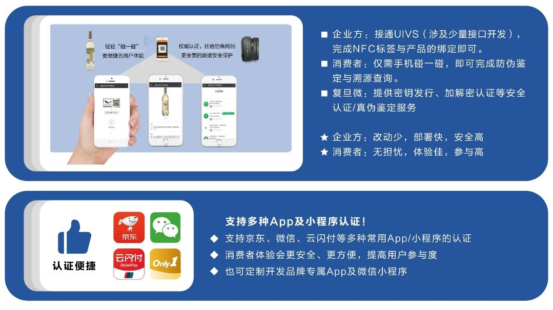 為了讓企業更便捷地用上PUF芯片指紋技術,復旦微提供UIVS(Uniqueness Issuance and Validation    Services),即“唯一性發行與認證服務”,這是一項圍繞PUF芯片應用的安全系統解決方案,旨在為客戶提供PUF芯片相關的密鑰生產發行、云認證、跨域互通以及可信存證服務。且UIVS服務支持多種App/小程序的認證,即消費者直接使用京東app、銀聯云閃付app、微信小程序、真品無雙、品牌定制app/微信小程序即可實現快速認證和溯源查詢。