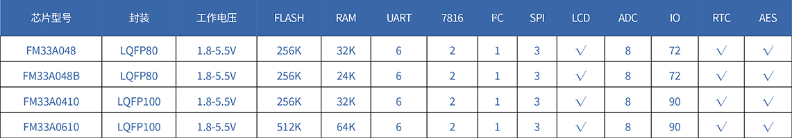 上海復旦微電子集團股份有限公司智能電表MCU包括32位Cortex-M0內(nèi)核FM33A0xx/FM33A0xxB系列芯片及16位增強型8xC251內(nèi)核FM33xx系列芯片。最大支持512KB FLASH程序存儲器和 64KB RAM,并集成LCD驅(qū)動、帶溫補的RTC、ADC、AES以及UART、I2C、SPI、7816等通用外設接口。